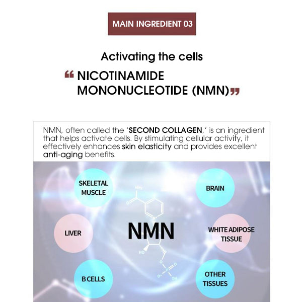 - Cell-energizing NMN (“the second collagen”) – NMN helps stimulate cellular activity, supporting skin’s natural renewal processes while enhancing elasticity for smoother, firmer skin.