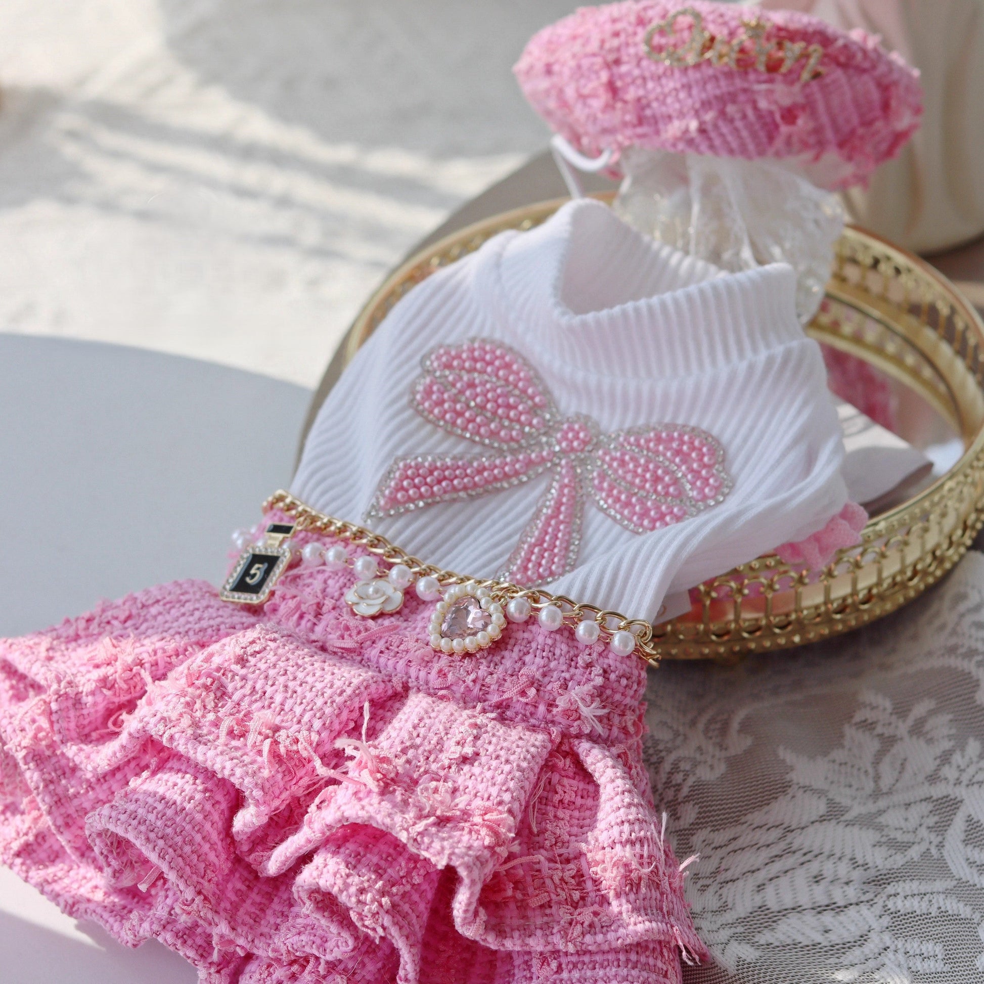 Dress your pet in chic Parisian style with this pink tweed skirt set. Featuring a ribbed knit top decorated with a rhinestone bow, layered ruffle skirt, pearl chain belt, and a matching beret, this outfit is both elegant and playful. Comfortable yet eye-catching, it’s suitable for spring, autumn, and festive occasions.